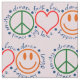 Peace, Unity, Dream, Faith, Hope, Dance, Laugh, Happiness, Love, Joy. With the symbols of peace, a heart and a face. In green, red, orange, and blue. Light pink background.