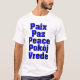 Do you like peace theme shirts? This shirt says peace in French, Spanish, English, Dutch and Polish in a blue and black heart pattern.