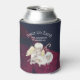 A christian themed can cooler. Designed with a sweet angel with yellow wings holding a shepherds crook. Sitting with white fluffy lambs. Navy blue and burgundy watercolor background, with tiny flecks of faux gold sparkle glitter (not actual glitter just a printed image). Text says: peace on earth and goodwill toward all.