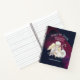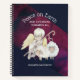 A christian themed personalized spiral notebook. Designed with a sweet angel with yellow wings holding a shepherds crook. Sitting with white fluffy lambs. Navy blue and burgundy watercolor background, with tiny flecks of faux gold sparkle glitter (not actual glitter just a printed image). Text says: peace on earth and goodwill toward all.