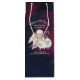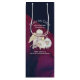 A christian themed wine gift bag. Designed with a sweet angel with yellow wings holding a shepherds crook. Sitting with white fluffy lambs. Navy blue and burgundy watercolor background, with tiny flecks of faux gold sparkle glitter (not actual glitter just a printed image). Text says: peace on earth and goodwill toward all. Merry Christmas from <name>.