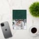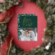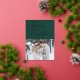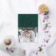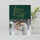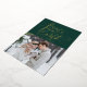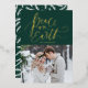 Elegant Christmas card featuring "Peace on Earth" displayed at the top in a hand-lettered gold foil script with your name and photo displayed below on a green background. The back of the gold foil Christmas card features a pattern of white pine branches and dots with a green background (or colour of your choice).
