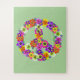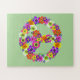 A floral peace sign in shades of pink, yellow, orange, purple, green, white and black.