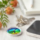A graphic hippie peace sign design by artist/designer Charmaine Paulson on a keychain.