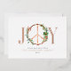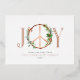 Illustration of peace rustic wood peace sign decorated with Christmas botanicals incorporated into word "JOY"