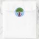 The colourful, sturdy tree in the watercolor illustration on this sticker has a simple message. Under the tree’s mottled bright green canopy, a peace symbol is carved into its fuschia-coloured trunk. In deep purple, distressed lettering behind the tree is the word “peace” with the wider part of the tree trunk representing the “a”. This text and the background colour behind the design can easily be changed to suit your own tastes. From my original digitally created image.