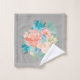 A custom bath set with bath towel, hand towel and washcloth featuring a bouquet of peach and aqua mixed flowers in soft watercolors. The background shown is a neutral grey. Personalize with your name or other desired text. You can also delete the name if you prefer the towel set without text.