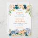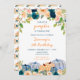 This cute and whimsical watercolor birthday party invitation features peach orange, baby blue and navy blue pumpkins and floral arrangements. The text combines handwritten script and sans serif fonts for a stylish and modern look. This is perfect for an autumn fall birthday party.