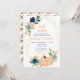 This cute and whimsical watercolor bridal shower invitation features peach orange, baby blue and navy blue pumpkins and floral arrangements. The text combines handwritten script and sans serif fonts for a stylish and modern look. This is perfect for an autumn fall bridal shower.