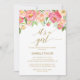 This peach and pink peony flowers it's a girl invitation card is perfect for an elegant girls baby shower. The floral design features a beautiful arrangement of watercolor peonies in shades of blush and coral matched with dainty faux gold foil calligraphy.