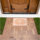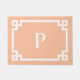 Decorative white Greek Key style geometric rectangular border on a light orange 18" x 24" door mat with a modern serif monogram.