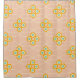 Hexagonal floral pattern with blue-green centers and orange outlines on a peach background. White lines connect the shapes, creating a geometric grid.