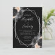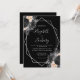 This elegant modern wedding invitation features a silver geometric frame decorated with burgundy and silver floral bouquets on a black background. The customizable text combines silver grey whimsical handwriting, copperplate and italic fonts. The reverse side is solid black.