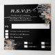 A beautiful all-in-one luxurious and glam design featuring mother of pearl butterflies flitting across a black background that has charcoal black roses edged with faux silver sprigs. The outside is a pale peach colour and the lift up flap has the same black with delicate floral design. The bottom third has a tear off response card with personalized rsvp address and meal options for your guests to complete. These are ideal for a spring; summer; fall or winter wedding; for a black and peach theme party or for a luxurious and elegant themed wedding anniversary celebration.