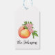 These gift tags feature a watercolor portrait of a peach with a pink flower accent.