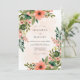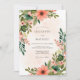 This design features a soft watercolor palette of peach and coral blossoms intertwined with lush sage green foliage. Large cosmos flowers are complemented by delicate pink clusters and airy stems. A subtle cream wash provides a soft backdrop, creating a romantic and organic atmosphere. These botanical elements evoke a fresh, natural feel.