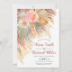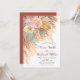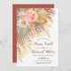 Coral peach watercolor cactus flowers and leaves soft terracotta floral boho arch wedding Invitation. This elegant design showcases an arch frame and peach watercolor cactus flowers with succulent and leaves on the upper left and bottom right corners and your text in terracotta and black. Behind the frame there is a watercolor splash background in soft terracotta colour.