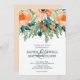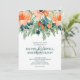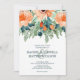 Elegant watercolor of flowers in shades of peach to orange trimmed with teal to jade green foliage on a dark teal background with your wedding ceremony details in chic pale peach lettering. A modern yet simple choice for any season wedding invitation. MATCHING items in our collection.