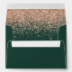 The inside of this elegant modern wedding invitation envelope features a peach faux glitter design on a dark emerald green background. Customize the back flap with the names of the bride and groom in pale peach handwriting script and return address in copperplate font on an emerald green background.