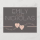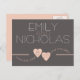 Peach Hearts over grey modern save the date postcard that you can customize with your own names, date and text.