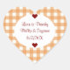 Un design doux et pêche pour les pots de gelée de pêche de mariage, ce étiquette autocollant en forme de coeur dispose d'un arrière - plan dans un motif intemporel en vichy de peachy orange avec une police ovale blanche et rouge. Il y a deux coeurs rouges et les noms de la mariée et du marié avec la date du mariage et un proverbe romantique. Tous les champs de texte sont modèles pour vous faciliter la personnaliser. Ils travaillent très bien pour la confiture et les conserves aussi.