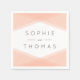 This modern wedding napkin has a peach layered geometric design featuring the names of the wedding couple. Check out other matching wedding items https://www.zazzle.com/collections/peach_layered_geometric_light_sage_wedding-119919264900833968?rf=238364477188679314&tc=rc .