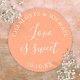 Peach wedding favor love is sweet classic round sticker. Designed by Thisisnotme©