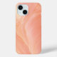 This phone case features an abstract design with a warm, soft peach-pink colour palette and flowing curves. It's characterized by a delicate and intricate pattern, much like marble or the inside of a mother-of-pearl shell. The subtle glitter and sheen that sparkle in the light create a dreamy and sophisticated atmosphere.