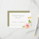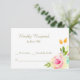 This pretty wedding response card features a watercolor pink and tangerine peach single rose image surrounded by colourful greenery at the right bottom corner. Your custom text is in dark gold at the right. All is placed on an elegant white background. The back of the invitation is gold, matching the text colour. Appropriate for weddings in any season! This card matches invitations and other wedding products in our store.