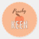 Peachy Keen text, with peach image Peach coloured round stickers and scalloped edges.