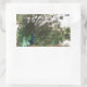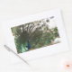 A photograph of a beautiful male peacock showing off his gorgeous tail plumage feathers for a female albino peahen on a sticker