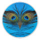 Bird face created from mirrored peacock feather images on a blue metallic background.
