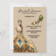 A beautiful bonde woman with long hair cascading over her left shoulder is wearing a golden peacock feather plume ball gown and a tiara made of feathers and pearls to match. A single faux gold high heel stiletto shoe appears next to hear and they are set against dusky pastel cream background that has custom black templates on it for your personalized wording. This "bridal shower" invitation is ideal for any Muslim, Islamic, Hindu, Hindi, Indian; nature, bird or outdoor event.