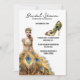 A beautiful bonde woman with long hair cascading over her left shoulder is wearing a golden peacock feather plume ball gown and a tiara made of feathers and pearls to match. A single faux gold high heel stiletto shoe appears next to hear and they are set against a white background that has custom black templates on it for your personalized wording. This "bridal shower" invitation is ideal for any Muslim, Islamic, Hindu, Hindi, Indian; nature, bird or outdoor event.