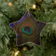 Lovely peacock feather still life with Christmas tree and lights in the background. Very festive design that makes a great gift for someone that loves peacocks