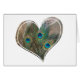 Fun peacock feather design with a double heart and a peacock feathers against a brown rock background in a heart shaped design. Great gift idea.