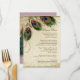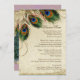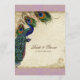 COLOR PALETTE: lilac lavender, tan, cream royal blue, green, and rust. DESIGN: Matching Dinner Menu Card. The bride and groom's names and wedding date are on the front of this design. This antique vintage inspired wedding collection has a complete ensemble of products and can be created in several colorways. If you would like it to match your wedding let us know via email and we'll be happy to assist you. This design consists of a stately peacock on a tree branch vintage art element layered three peacock feathers and over an angel etching, swirls, antique handwriting, hand painted lace overlaid on parchment and a beautiful original art damask pattern. The plum lavendar background colour can be changed to match your wedding.