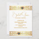 A beautiful golden peacock feather plume rests between two horizontal gold lines and is adorned with decorative flourish swirls that rest against a stark white background. The same detail is found at the top and bottom edge of this "save the date" invitation that has golden templates on it for your custom wording. This design is ideal for any Muslim, Islamic, Hindu, Hindi, Indian; tropical; garden or outdoor bridal shower; wedding; anniversary or event.