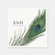 A set of unique paper napkins for your elegant wedding event. It features an image of an elegant peacock feather towards the side. On the opposite side of this are your bride and groom's initials and wedding or engagement date.