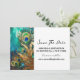 The left edge of the invitation is delicately adorned with four luxurious peacock feathers, each one trimmed with elegant faux gold. These iridescent feathers appear to shimmer in hues of deep blue and emerald, bringing a sense of opulence to the card. To enhance the design's ethereal quality, small pearls rest gently on the outer plumage, adding a touch of refined charm.
