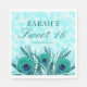 Elegant glittery teal and blue peacock feathers Sweet 16 birthday party paper napkins personalized with the name of the guest of honour.
