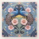 Vintage ceramic tile featuring two peacocks facing each other with pink flowers, blue feathers, brown tail, yellow details, surrounded by leaves and floral ornaments, on a blue background.