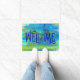 Watercolor painted background in chic bold peacock colours of blues - greens with a bright blue peacock feather pattern and bold blue peacock. The welcome greeting is also in the same bold blue colour using a vintage style display typography. Make your own custom doormat with your family name, surname or funny quote. Or take off the text and text bar.