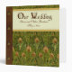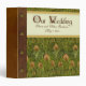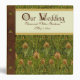 This lovely album features beautiful green and amber peacock feathers. The edges and spine have faux brown leather with triangular studs. The first letters of "Our Wedding" is in a font with acorn decorations.