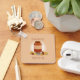 Keychain with an illustrated design of a smiling peanut butter jar that is standing between two piles of peanuts. The words “Peanut Butter? Peanut Better!” show above and below the cartoon character. All of the words can be customized.