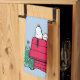 Enjoy this Peanuts holiday design featuring Snoopy sleeping on his dog house beside his Christmas tree.