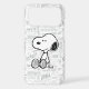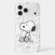 This Peanuts artwork features Snoopy sitting on background of black and white Charles M. Schulz comic strips.