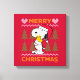 Celebrate the holidays and your love of Peanuts with this Ugly Christmas sweater design featuring Snoopy and Woodstock in a loving hug.