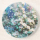 A vibrant cluster of white flowers stands amidst a dreamy backdrop of softly coloured vegetation, with hints of blue and pink hues. Pearlescent orbs float around the flora, adding a touch of whimsy to the scene.