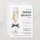 Elegant 'Pearls and Prosecco' Bridal Shower Invitation featuring a black bow, champagne glass, and chic pearl accents. Perfect for a stylish brunch bridal shower.